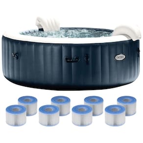 Intex modelo 28431EP O spa redondo com banheira de hidromassagem portátil e inflável para 6 pessoas permite que você relaxe com estilo com o toque de um botão com 170 jatos de alta potência A construção Fiber Tech extra durável e o material laminado de 3 camadas resistente a perfurações resistem ao uso durante todas as estações Inclui cobertura, filtragem, soprador de ar, 1 luz, 6 filtros, 2 apoios de cabeça, pano de chão, mangueira de inflação, bolsa, dispensador de cloro e viagens de teste O sistema integrado de tratamento de água dura torna a água mais suave para a pele, as roupas e todo o sistema do spa e evita a formação de resíduos de cálcio Para máxima eficiência, limpe os cartuchos semanalmente e substitua os uma vez por mês ou antes Inclui 6 cartuchos de filtro