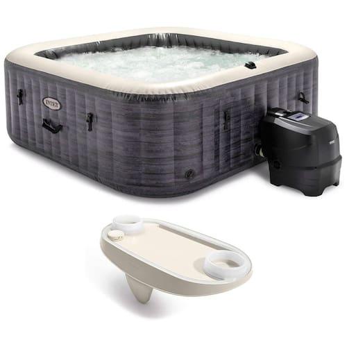 O pacote de banheira de hidromassagem inclui PureSpa modelo 28451EP Plus Greystone inflável Square Hot Tub Spa, 239 x 71 centímetros e bandeja para celular para tablet, branca. O spa com banheira de hidromassagem quadrada, portátil e inflável para 6 pessoas permite que você relaxe com estilo com o toque de um botão. Mimar se é mais fácil do que nunca com 140 jatos calmantes de alta potência e temperatura da água de até 40 graus Celsius. Mantenha bebidas, tablets e smartphones s ao lado do seu Intex Pure Spa com a bandeja Intex Spa. A faixa de luz LED branca ao longo da borda da bandeja fornece luz ambiente Assista a filmes no seu tablet sem deixar cair o dispositivo na água Marca: Não Informado