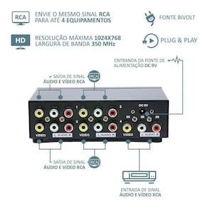Splitter Av Áudio E Vídeo Para Circuito Tv Vigilância Bar Distribuidor Rca Áudio Vídeo Composto 1x4 Splitter Av Este é 1x4 portas de áudio e vídeo AV RCA Splitter Box para HDTV DVD. Ele permite 1 dispositivo para entrada e 4 compartilhamentos de saída AV . Podendo ser em qualquer dispositivo rca e av . Para mostrar a uma entrada AV em 4 diferentes saídas AV Dispositivos como TV ou outros dispositivos com padrão AV amarelo-vermelho-branco conector. Característica de produto: -LED indicador de energia -alimentado por um adaptador AC -plug and Play Componentes de alta qualidade, design de técnicas avançadas de circuito Isolamento, o sinal de saída não é distorcida, não interferem uns com os outros Especificação do produto: Entrada: AC 100-240 v/150ma Saída: DC 9 v/600ma Tipo de interface: 1 AV amarelo-vermelho-branco de entrada 4 AV amarelo-vermelho-branco Dimensões: Comprimento 22cm x Largura 8cm x Altura 4cm Conteúdo do pacote: 1x Splitter 4 portas RCA 1 x adaptador AC Marca: Não Informado
