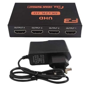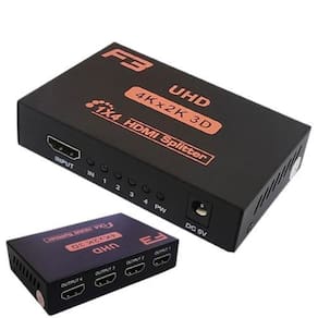Suporte 2k 4K 60hz, resolução de até 1080p / 4k 2k, desempenho de excelência. Caixa de metal Portas: conector HDMI 1x4 e 1 conector de alimentação Suporte ao formato de vídeo: Resolução HDMI: 24/50 / 60fs / 1080P / 1080i / 720P / 576P / 576i / 480P / 480i Com função de amplificador de sinal. Com adaptador de energia Protocolo HDCP 1.2 compatível. Suporta CEC. Suporta cores profundas de 30 bits, 36 bits. Suporta Blue-Ray 24/50 / 60fs / HD-DVD / xvYCC Suporte de entrada de até 15 metros de comprimento de cabo padrão AWG 26HDMI 1.3. Corrente de trabalho máxima: 600mA Entrada do formato do adaptador de energia: CA 50Hz 60Hz 110-240V; Saída DC5V / 1A Cor: preto Taxa máxima de transmissão: 6.75gbps