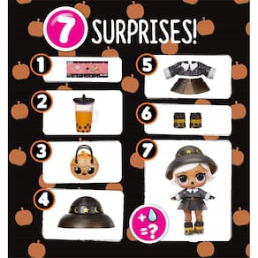 Entre no espírito assustador com l.O.L. Surprise! Sparkle assustador. Unbox 7 surpresas incluindo uma edição limitada Witchay Babay boneca, que tem uma maquiagem brilhante com detalhes de glitter, nova moda, um acessório de abóbora doce ou deleite e muito mais. A boneca brilha no escuro! Depois de expor a boneca à luz, coloque Witchay Babay em um espaço escuro para revelar sua surpresa brilhante no escuro! Inclui uma nova embalagem de bola de abóbora com alça, para que possa ser como bolsa ou para doces ou travessuras. Cada surpresa de L.O.L. ! A boneca Spooky Sparkle inclui 7 surpresas: (1) Mensagem Secreta; (2) Garrafa; (3-4) Acessórios; (5) Roupa; (6) Sapatos; (7) Surpresa L.O.L. Spooky Sparkle edição limitada Witchay Babay boneca. Colete as duas bonecas de edição limitada – Witchay Babay e Bebé Bonita – com L.O.L. Surprise! Sparkle assustador.