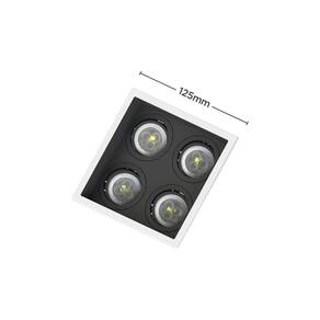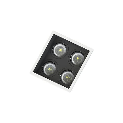Dimensões AxLxP mm : 35x125x125;Material: Termoplástico Proshield UV;Garantia: 5 anos junto ao fabricante;Grau de Proteção: IP 20;Lâmpada Inclusa: Não;Lâmpada Indicada: MR11;Local de Uso: Interno;Número de Lâmpadas: 4;Soquete: GU10;Nicho para Instalação: 117x117x65Mm A profundidade pode variar de acordo com a lâmpada utilizada;Formato: Quadrado;Voltagem: Bivolt;Foco Orbital: 360;Compatibilidade: Utilizar somente com lâmpada LED;Sistema Click: Substitui a lâmpada sem remover o embutido;Itens Inclusos:1 Spot de Embutir Recuado para 4 Lâmpadas Ean: 7908442007997
