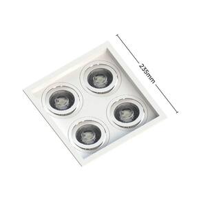 Dimensões AxLxP (mm): 35x235x235;Material: Termoplástico Proshield UV;Garantia: 5 anos junto ao fabricante;Grau de Proteção: IP 20;Lâmpada Inclusa: Não;Lâmpada Indicada: PAR20;Local de Uso: Interno;Número de Lâmpadas: 4;Soquete: E27;Nicho para Instalação: 220x220x125*mm *a profundidade pode variar de acordo com a lâmpada utilizada;Formato: Quadrado;Voltagem: Bivolt;Foco Orbital: 360;Compatibilidade: Utilizar somente com lâmpada LED;Sistema Click: Substitui a lâmpada sem remover o embutido;