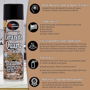 - Limpador de pedra personalizado: o limpador de granito e quartzo da Rock Doctor é especialmente projetado e formulado para uso em superfícies de pedra natural. A fórmula não abrasiva deixa resíduos e sem riscos. Especificamente projetado para limpar bancadas de pedra, penteadeiras e mesas com segurança. Para uso em granito, mármore, quartzo, silestone, corian, travertino, azulejo de porcelana, azulejo de cerâmica e muitos outros.