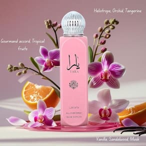 - Yara All Over Spray da Lattafa é um aroma doce e tropical com heliotrópio floral e orquídea, um coração divertido de notas gourmand e frutadas, e uma base quente de baunilha, sândalo e almíscar para um acabamento cremoso e duradouro.