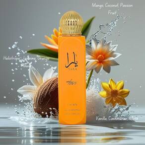 - O spray Yara Tous All Over da Lattafa abre com uma explosão tropical de manga, coco e maracujá, derrete em um coração floral cremoso de heliotrópio, jasmim e flor de laranja, e termina com uma mistura quente de baunilha, caxemira e almíscar para uma trilha suave e persistente.