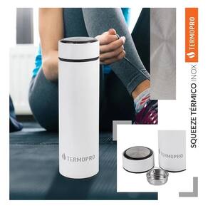 Squeeze Térmico Inox Branco 500Ml - Termopro Agora com este lindo lançamento da termopro o squeeze em aço inox veio para facilitar sua vida ; Com muitas elegância e um design inovador , vai facilitar muito sua vida em casa, trabalho, academia etc. Com dupla parede de inox para suportar sua bebida preferida quente por 12 horas e fria por 24 goras Características: - sistema de rosca com vedação á prova de vazamento - ampola térmica com dupla camada em aço inox - filtro em aço inox Dimensões: Altura: 22 cm Largura: 6 cm Diâmetro: 6 cm Peso:260 g Ean: 7899631654651