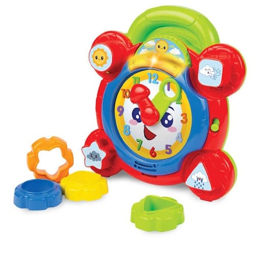 Relógio de aprendizagem ponteiros giratórios 4 blocos classificadores de forma com efeitos sonoros climáticos (Sol, Vento, Nublado e Chuva) Disco giratório mostra dia e noite Efeitos sonoros, melodias alegres e luzes intermitentes"