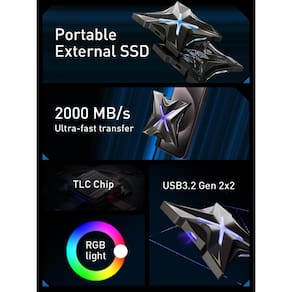 - ?Design super legal e moderno?O SSD externo de 2 TB da série MOVE SPEED Ray X20 tem um design mecânico simplificado em forma de "X", inspirado na plataforma de lançamento de uma espaçonave alienígena e incorpora o elemento "X" representando o símbolo misterioso nele. Após milhares de polimentos, torna-o o brilho e os contornos de uma nave espacial. Efeitos de iluminação RGB legais, luzes saltando e fluindo durante todo o processo de uso, dando a você uma extraordinária experiência de transmissão avançada.