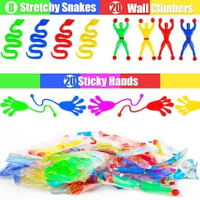 - Pacote super econômico — 20 unidades de Wall Climber Men, 20 peças Sticky Hands e 8 peças de Sticky Stretchy Snakes em uma caixa de presente requintada. Cada brinquedo de vinil é embalado individualmente, garantindo uma nova condição antes de jogar.