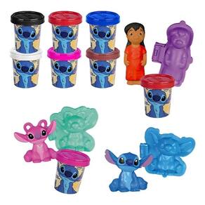 Este kit incrível vem composto por 6 potes de massinha de 60g cada, em cores vibrantes e textura macia, fáceis de modelar (azul, rosa, lilás, verde, amarelo e laranja), além de 3 moldes personalizados: Stitch, Angel e Lilo modelinhos super fofos para estimular o faz-de-conta.