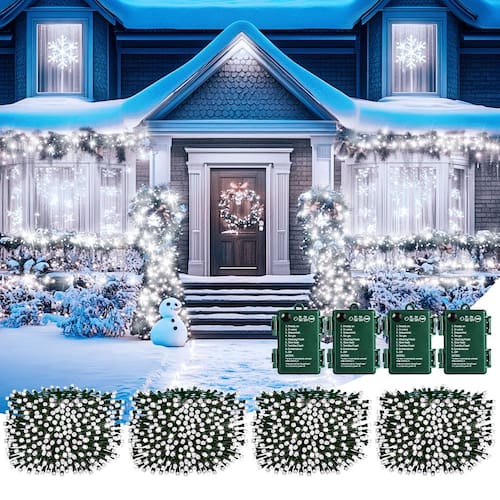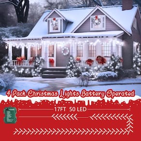 Brightown Luzes de corda de Natal operadas a pilhas, pacote com 4 unidades totais de 200 luzes de LED com temporizador, 8 modos, luzes de Natal impermeáveis ao ar livre, luzes de corda para quarto - Pacote com 4 luzes de corda operadas por bateria com fio verde: cada pacote de luzes de fadas operado por bateria tem 43 metros de comprimento, 50 LED, ilumina o ambiente feliz para sua reunião de família - Luzes LED de Natal com temporizador automático: esta corda de luzes para quarto tem uma função integrada de temporizador de 6 horas ligado/18 horas desligado. A função de temporizador é ativada automaticamente enquanto as luzes internas ligam. Não precisa de configuração manual - Luzes de corda alimentadas por bateria ao ar livre: as luzes brancas com temporizador funcionam com 3 pilhas AA (não incluídas). A caixa de bateria adiciona uma camada de borracha adicional para aumentar a impermeabilidade, permitindo que as luzes operadas por bateria sejam usadas não apenas em ambientes fechados, mas também ao ar livre - 8 modos de iluminação: estas luzes de natal para decoração externa têm 8 modos de iluminação diferentes, incluindo estável, em onda, sequencial, slo glo, perseguição/flash, desbotamento lento, cintilação/flash, combinação. Pressione o botão na caixa da bateria para selecionar o modo de iluminação que você gosta - Amplamente aplicação: As luzes de Natal da bateria emitem um brilho aconchegante e convidativo que são muito adequados para quarto, casamento, festa, interior, exterior, jarro de pedreiro, peça central de mesa, projetos de artesanato e bricolage, e também amplamente aplicado em Natal, luzes de carnaval, iluminação festiva e luzes de decoração
