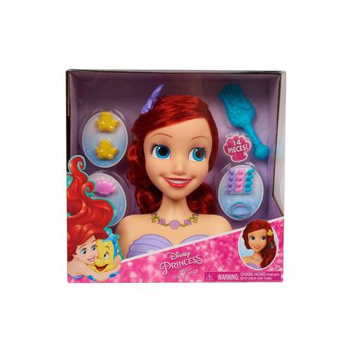 - A cabeça estilizadora Disney Princess Ariel vem com longos cabelos ruivos e 13 acessórios de estilo.