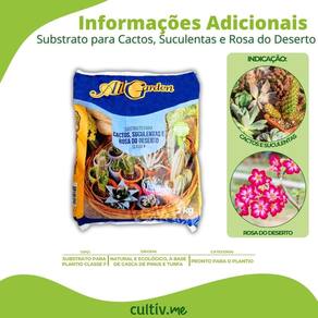 Características * Produto: Substrato para Cactos e Suculentas; * Peso Líquido: 2Kg; * Marca: All Garden; * Composição: Turfa, Casca de pinus, Argila expandida triturada e Areia. * Natureza Física: Sólido; * Modo de Aplicação: Via Solo. * MAPA: SP009031-0.000004
