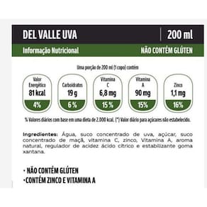 Suco Pronto Del Valle Fresh Uva 200Ml- 48 UnidadesRefresco Fresh sabor Uva Del Valle 200ml: Del Valle é produzido com frutas cuidadosamente cultivadas. É feito com néctar de fruta, o que garante um sabor muito mais natural e fresquinho ao suco. Tamanho: 200ml Sabor: Uva Marca: Dell Vale