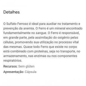 Ficha técnica: O Sulfato Ferroso é um sal composto por 20 % de Ferro, sendo, portanto, uma rica fonte deste mineral. é ideal para a prevenção de deficiência de Ferro no sangue.