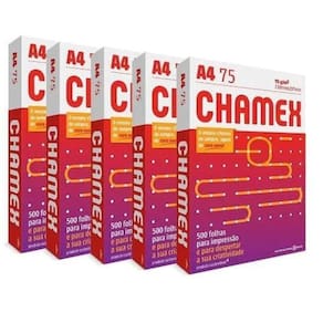 Chamex oferece a melhor solução para suas impressões, com garantia de qualidade Profissional. Superfície resistente, corte perfeito e absorção equilibrada que permite o melhor deslizamento na impressora evitando desperdício de tinta. O sulfite Chamex é produzido a partir de florestas 100% plantadas e renováveis e suas fibras são tratadas para obter o mais alto grau de brancura. O sulfite Chamex garante 99,99% não atolamento em impressoras.Especificações: - Gramatura: 75g/m- Folhas/resma: 500 em cada pacoteDimensões:- Formatos: A4 (210 x 297 mm)Embalagem:- 2500 folhas- Caixa com 5 resmas