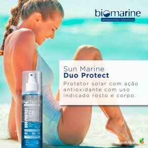 O Biomarine Protetor Solar Sun Marine Duo Protect FPS 65 é um protetor solar bifásico com alta performance, indicado para uso diário no rosto e no corpo. Combina proteção avançada com toque seco e rápida absorção, deixando a pele confortável e protegida ao longo do dia.Oferece Fator de Proteção Solar (FPS) 65 e PPD 25, ajudando a resguardar a pele contra os efeitos da radiação UVA e UVB. Resistente à água, proporciona até 18 horas de proteção e 12 horas de sensação de hidratação. Ideal para todos os tipos de pele, especialmente durante períodos de maior exposição solar.Benefícios e característicasFPS 65 com alta proteção contra raios UVA e UVBToque seco e rápida absorçãoFórmula bifásica inovadoraResistente à águaProteção prolongada de até 18 horasSensação de hidratação por até 12 horasIndicado para rosto e corpoTextura leve e confortávelAtivos presentesCarcinina – contribui para manter a pele com aparência uniforme e saudávelCaviar – ativo marinho que auxilia na hidratação e proteção contra agentes externosEnergenius - Proteção prolongadaModo de usoAgite antes de usar para misturar as fases. Aplique de maneira uniforme sobre a pele seca antes da exposição ao sol. Reaplique sempre que necessário.