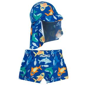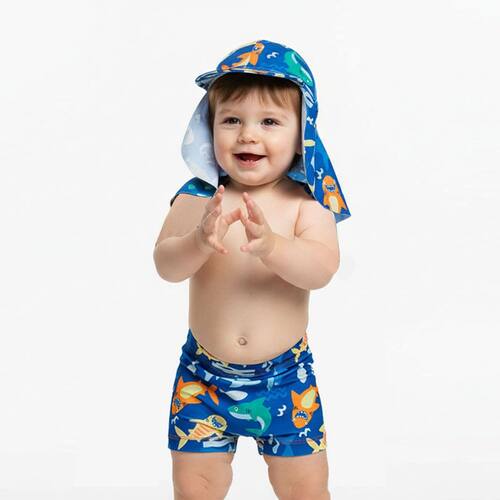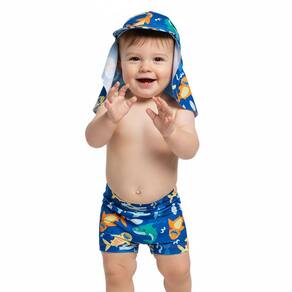 Todo o charme da sunga boxer bebê, com o boné legionário de divertidos tubarões pra completar o look. Este conjunto de Shorts Praia menino com boné legionário da Coleção Tuba Colors da Tip Top é perfeito para a praia e piscina. Possui proteção solar FPS 50+ permanente, com a qualidade Tip Top.
