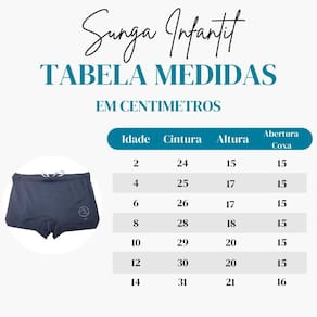 - Tamanho 12 (Indicado para 11-12 anos) - cintura 31-32 cm | Altura 23-24 cm | Abertura coxa: 17-18 Cm