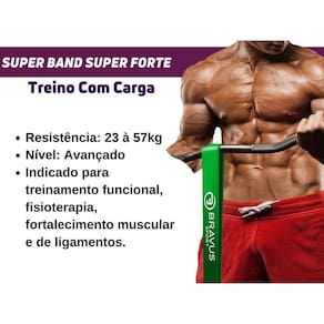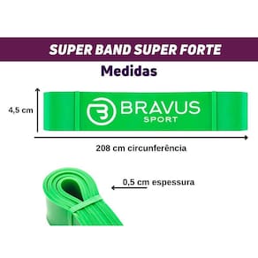 Super Band Bravus Sport Super Forte Elástico Barra Fixa Kit Super Band Bravus Sport Super ForteSuper Band Super Forte VerdePerfeita para iniciantes que desejam uma progressão rápida na barra fixa, a Super Band Bravus Super Forte é o verdadeiro titã da linhaPara flexões e flexões assistidas, basta passar a faixa por cima de uma barra fixa e você terá um apoio para se exercitar e evoluir na execução do exercício.A super band também funciona muito bem para treinamentos de velocidade e agilidade, força, treinamento funcional, cruzado, Artes Marciais Mistas (MMA) e muito mais.Assista uma de nossas vídeo aulas e aprenda como usar sua Super Band e leve o seu treino para o próximo nível. Barra Fixa:Para quem precisa de maior assistência para executar os exercícios na barra, pull up ou muscle up e progredir com mais rapidez, tenha a sua disposição e atinja os resultados que você sempre buscou Tenha assistência de 40 à 50% na elevação da barra fixa com a Super Band Super Forte.Na barra fixa, comece com a super band Verde e vá evoluindo para Roxa para ter assistência mediana.As super bands mais finas, como a Preta e vermelha são mais leves e permitem uma assitência leve.Isso lhe ajudará a conseguir uma evolução rápida e completa.A Super Band apresenta um design de alta qualidade e é feita com borracha espessa e durável. A Super Band Super Forte Verde tem as seguintes especificações:Super Band Elástico Extensor Borracha - Nível Super Forte Nível: Avançado Resistência: 45Kg Beneficios: Fortalecimento e Definição Muscular Dimensões: 4,5 cm largura x 0,5 espessura x 208 comprimento dobrado Cor: Verde Material : Látex de Alta Resistência Beneficios e Uso:Progressão na Barra Fixa Assistida: Você pode usar as super bands para ajudar sua progressão na barra fixa e evoluir com mais rapidez.As super bands compensam o peso do seu corpo para que você obtenha mais repetições e aumente a força mais rapidamente.Alongamento e Fortalecimento: As super bands são adequadas para treinar seus braços, costas, ombros, pernas e bumbum de uma só vez.Eexercício e Reabilitação: Perfeito para treinamento funcional, yoga e fisioterapia, as super bands são excelentes para ajudar a fortalecer os ligamentos e músculos.As Super Bands de resistência pesada são usadas até mesmo para a maioria das Reabilitações musculares.Qualidade - Por serem feitas com Látex 100% Natural, as super bands da Bravus são duráveis e podem ser esticadas repetidamente ano após ano. Adequado para qualquer nível de praticante - Cada Super Band oferece um nível diferente de resistência, tanto para o treinamento de barra fixa, como para adicionar resistências ao supino, flexões, agachamento e levantamentos.