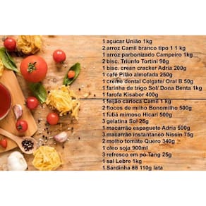 Super Cesta Básica 30 Itens produtos de Marca Completo Doação Produtos De Qualidade. 1 açucar União 1kg 2 arroz camil branco tipo 1 1 kg 1 arroz parbonizado Campeiro 2 bisc triunfo tortini 90g 1 bisc crean cracker Adria 200g 1 café pilão almofada 250g 1 creme dental colgate/ Oral B 50g 1 farinha de trigo Sol/ Dona Benta 1kg 1 farofa kisabor 400g 1 feijão carioca camil 1 kg 2 flocos de milho bonomilho 500g 1 fubá mimoso hicari 500g 3 gelatina sol 25g 1 macarrão espaguete adria 500g 3 macarrão instantaneo nissin 75g 2 molho tomate quero 340g 1 oleo soja soya 900ml 3 refresco em pó tang 25g 1 sal lebre 1kg 1 Sardinha 88 110g Obs.: Garantimos como marcas dos produtos da cesta salvo em caso de falta de fabricante/por necessidade de , no caso de por outro de igual qualidade. Marca: Não Informado