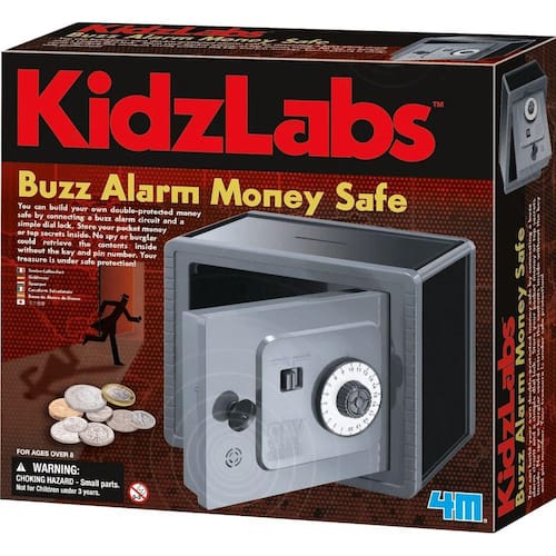 Super Cofre Brinquedo Educativo 4M ou Buzz Alarm Money Safe em seu nome original, possibilita com que a criança construa seu próprio cofre duplamente protegido conectando um circuito de alarme sonoro e uma trava de discagem simples.