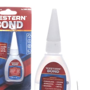 Super Cola Instantanea Western 10g. Especificacao Tecnica Super Cola e um adesivo instantaneo, de alta qualidade, para reparos precisos, alta performance, facil de usar, transparente, com forca instantanea em uma unica gota, usa a tecnologia de cianoacrilato que garante reparos invisiveis e duraveis. Adere rapidamente uma ampla variedade de materiais porosos e nao poroso, como porcelana, metal, borracha, papel, madeira, ceramica, plastico, etc. - Caracteristicas: Adesivo Instantaneo Universal; Pequenos reparos; Fixacao imediata. - Serve para colagem de: Porcelana. Borracha. Couro. Madeira. Papel. Metal. *Imagens meramente ilustrativas. Descricao