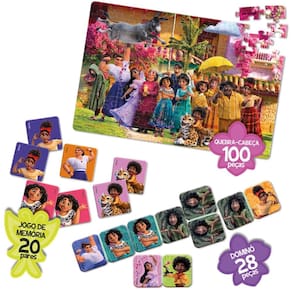 Super Kit 3 Jogos Em 1 Encanto Quebra-cabeça -3036 Toyster Descrição: Divertido kit com quebra-cabeça 100 peças, jogo de memória com 20 pares e dominó com 28 peças de Encanto 3 em 1: quebra-cabeça de 100 peças, dominó de 28 peças e jogo de memória com 20 pares Material resistente e de alta qualidade; Estimula a habilidade motora e o raciocínio lógico, Diversão sozinho, com amigos ou em família