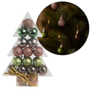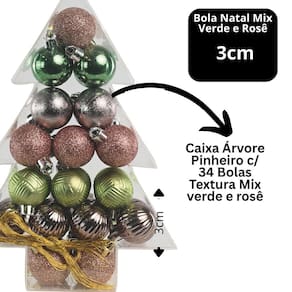 Super Kit com 34 Bolas de Natal Verde e Rosê – Texturas Variadas | 3cm | Embalagem em Formato de Pinheiro