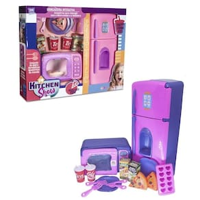 o kit vem com geladeira e microondas com comidinhas, mercado completo, comidinhas, air fryer, cafeteira, jogo de panela, fogão com panelinhas, legumes