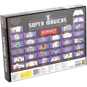 Super Kit De Mágicas - 30 Truques - Grow Que tal se tornar um mágico? Truques que vão surpreender a plateia! Super Mágicas traz copinho que atravessa a mesa, cordas mágicas, moedas que aparecem e desaparecem e muitas mágicas com cartas para deixar todos de boca aberta. Divirta-se! Participantes: 1 ou mais. Código: 054474 Dimensões aprox. da embalagem em cm: 27,1x37,6x5,5 Peso liq. Aproximado do produto na embalagem: 563g Referência do Modelo: 02713 Certificado Inmetro: CE-BRI/ICEPEX-N 01264-25 - NM300-2004 OCP 0046 Conteúdo da Embalagem: Baralho, fichas, cordões, copinho, balão, lenço preto, cartelas, adesivos, bloco de papel, bloco de papel impresso, moedas cartonadas, relógio cartonado, caixinhas cartonadas, varetas, cartas e manual de instrução. Composição/material: Cartonado, Plástico Idade recomendada: a partir de 8 anos Garantia: 90 dias contra defeitos de fabricação pelo fabricante Imagens meramente ilustrativas. As cores e tonalidades podem variar. Gênero - Meninas Meninos Unissex Idade - 8 Anos 9 anos 10 Anos 11 Anos Tipo - Mágicas Ean: 7908010127133