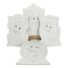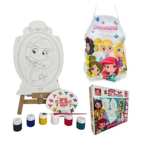 Contém: 1 Cavalete em madeira, 4 Telas para colorir, 1 Pincel, 1 Paleta, 6 Tintas guache, 1 Avental temático
