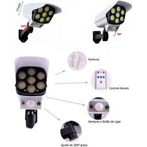 Super luminaria formato camera led potente moderna + segurança 7 cobs 42 super leds Super luminária solar sensor presença parede funções câmera 7 cobs 42 leds Proteja sua propriedade com a inovadora câmera placa solar detector de movimento externo. Esta luminária solar é mais do que apenas uma luz externa, é uma solução de segurança completa. Equipada com sensor de proximidade e tecnologia de detecção de movimento, esta câmera é alimentada por energia solar, proporcionando-lhe tranquilidade durante todo o dia. Com 42 leds e 7 cobs, esta luminária oferece uma iluminação brilhante e eficiente, enquanto seu design resistente às intempéries garante durabilidade em qualquer condição. A bateria de íon-lítio de 2800mah é recarregada em apenas 6-8 horas de exposição ao sol, mantendo-a pronta para a ação. Com três modos de sensor de movimento e um controle remoto conveniente, você tem o controle total sobre a segurança da sua casa ou estabelecimento. Não deixe sua segurança ao acaso, invista na câmera placa solar detector de movimento externo e proteja o que é importante para você. Essa câmera não grava ou filma, é uma camera fake luminaria solar fake Características: Fonte de energia: solar Quantidade de led: 42 Quantidade de cobs: 7 Detector de movimento: 2 a 3 metros de distância Recarga: 6-8 horas de exposição ao sol Bateria de íon-lítio: 3,7v 2800mah Resistência à água: ip65 Material: abs e componentes eletrônicos Sensor inteligente que desliga durante o dia Fácil de instalar 3 modos de sensor de movimento Distância de detecção de até 3m de altura Controle remoto incluso 4. Modo de usar: Instale a luminária em uma área externa com exposição adequada à luz solar. Certifique-se de que o sensor de movimento esteja livre de obstruções. Utilize o controle remoto para ajustar os modos de sensor conforme necessário. Ficha técnica: Leds: 42 Cobs: 7 Sensor de movimento: 2-3 metros Bateria: íon-lítio 3,7v 2800mah Resistência à água: ip65 Especificações: Material: abs e componentes eletrônicos Cores disponíveis: preta ou branca Modos de sensor: luz fraca, indução de luz forte, indução de luz baixa Distância de detecção: até 3m de altura Controle: remoto incluso Itens inclusos: 1 câmera placa solar detector de movimento externo 1 base de sustentação 1 controle remoto 1 kit parafusos Marca: Não Informado