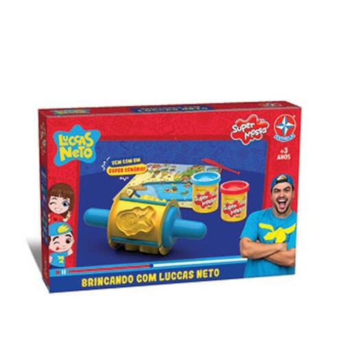 Super massa brincando com Luccas Neto, é um kit que vem com um super rolinho com as figuras do Luccas Neto, a Gi e a Foca para fazer com massinha e ainda um super cenário com tema de Parque Aquático.