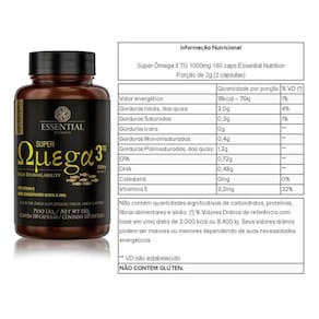 Super Omega 3 Tg 60caps - Essential Nutrition O Super Ômega 3 TG Essential é um suplemento nutricional de ômega-3 na forma de triglicerídeos, altamente concentrado em EPA (720mg) e DHA (480mg) em 2 cápsulas, obtido por processo patenteado de destilação molecular, que proporciona a pureza do óleo de peixe sem a presença de metais pesados e contaminantes como mercúrio, PCBs e dioxinas. Sua forma em triglicerídeos é a mesma encontrada na natureza, isso permite ao organismo uma maior facilidade para reconhecer a molécula e, consequentemente, promover uma maior absorção quando comparada à forma de etil éster (EE) - geralmente comercializada no mercado nacional. O consumo de ácidos graxos ômega-3 auxilia na manutenção de níveis saudáveis de triglicerídeos desde que associado a uma alimentação equilibrada e hábitos de vida saudáveis dispensado do registro da anvisa RDC 27/2018 Ean: 040232912122