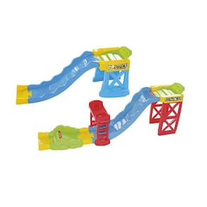 - Uma rampa de corrida radical com 03 formas de montagem para brincar e competir com os amiguinhos; - Vem com 02 veículos velozes aleatórios; - São 28 peças que montam: uma pista dupla, ou uma pista grande ou duas pistas; - Cores vibrantes e vem com cartela de adesivos para decorar; - Livre de Bpa;