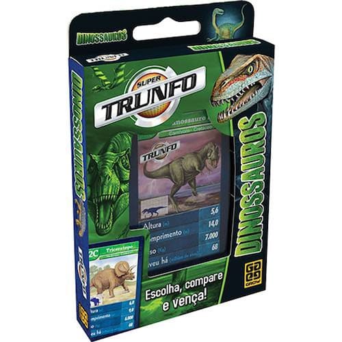 No Super Trunfo Dinossauros - Grow, você vai descobrir qual é o dinossauro mais alto, o mais pesado e muito mais. Escolha suas cartas, compare as características e vença essa emocionante disputa. Com um formato de jogo de cartas, ele é fácil de jogar e proporciona momentos de diversão para toda a família.
