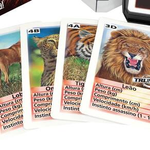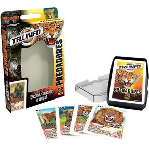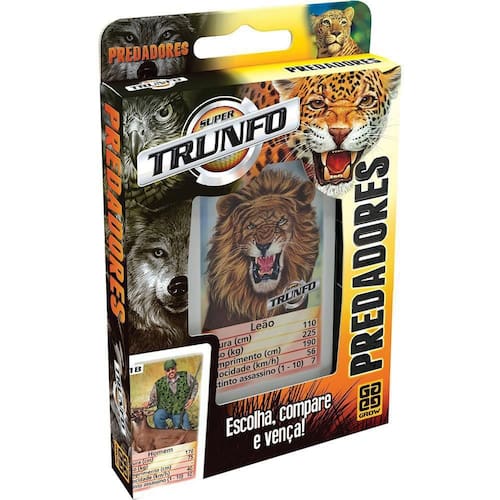 Super Trunfo Predadores traz 32 cartas com ilustrações e informações sobre os maiores e mais ferozes predadores do mundo animal. Em qual item o predador da sua carta é o melhor Será em altura Em velocidade Ou você tem o Super Trunfo Escolha, compare e vença esta emocionante disputa.