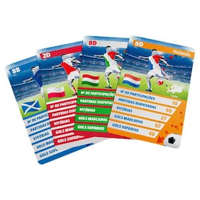 Super Trunfo Seleções do Mundo traz 32 cartas com imagens e informações de seleções do mundo para uma disputa superdivertida! Você compara sua carta com a do outro jogador. Mas escolha bem a característica que vai utilizar a cada rodada, pois, se sua carta ganhar, você fica com a carta do outro jogador; se perder, ele fica com a sua! No final, vence quem ganha todas as cartas do jogo.