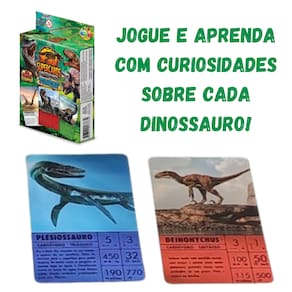 Como jogar? 54 Cartas colecionáveis ??com espécies reais de dinossauros! Cada carta traz curiosidades sobre o Dino – Torne-se um verdadeiro especialista! 6 Atributos diferentes – Escolha o melhor e derrote seus oponentes! O maior valor vence – Quem será o dinossauro mais forte do jogo?