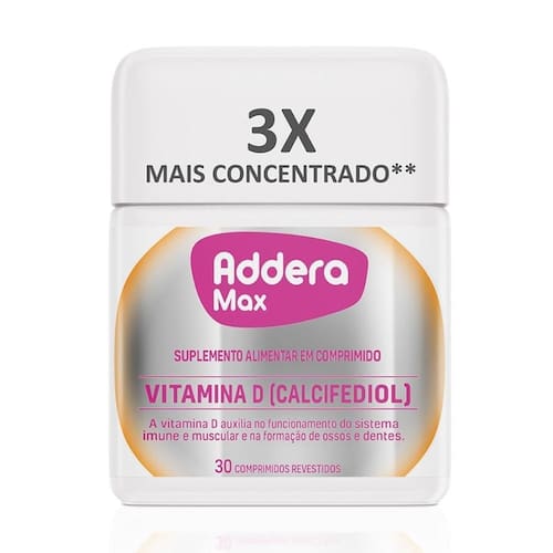 Addera max é um suplemento alimentar em comprimidos à base de vitamina d calcifediol . Com fórmula 3x mais concentrada, ele oferece melhor absorção, sendo mais eficaz, rápido e eficiente. Modo de uso: uso oral. Uso adulto acima de 19 anos. Ingerir 1 comprimido ao dia. Deve ser ingerido com liquido de prefêrencia junto a refeição. Não exceder a recomendação diária de consumo indicada na embalagem. Este produto não é um. Alérgicos: pode conter trigo, conteio, cevada, aveia e suas estirpes hibridizidas, crustáceos camarão, lagosta, lagostim e caranguejo , ovos, peixes, amendoim, soja, leites, amêndoas, avelãs, castanhas-de-caju, castanhas-do-pará, macadâmias. Contém glúten.