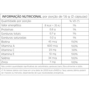 Colágeno pro lifeProduto dispensado de registro conforme RDC 240/2018Enriquecido com biotinaSuplemento alimentar de colágeno com biotina, vitaminas a, c, e, selênio e zinco em cápsulasBeleza absoluta com colágeno pro lifeTenha uma pele firme, unhas fortes, cabelos brilhantes e ossos resistentesO colágeno é uma das proteínas mais importantes do corpo humano, responsável por dar firmeza à pele, desempenha várias funções, tais como: manter as células unidas e fortalecer os tecidos, constituindo uma das proteínas fundamentais para órgãos como os ossos, cartilagens, tendões e pele.Fortalece a peleMelhora a saúde das articulaçõesBom para cabelos, pele e músculosForma novos tecidos e trata lesões na cartilagem articularAs vitaminas a, c, e, b7 biotina e os minerais zinco e selênio presentes na composição auxiliam para o bom funcionamento do organismo com ação antioxidante contra os radicais livres, protegendo contra a baixa imunidade, auxiliando para saúde da pele, unhas e cabelos e no bom funcionamento dos órgãos reprodutores.Cabelos fortes e saudáveis com um brilho ofuscante O poder da biotina encontrado no colágeno pro life da naturalmania, auxilia no metabolismo energético, proteínas, carboidratos e gorduras, contribuindo para dar mais brilho e hidratação para seus cabelos. A biotina junto com o zinco atua de dentro para fora no mecanismo celular dos fios de cabelos, mantendo-os sempre lindos e saudáveis. Unhas firmes e saudáveisA biotina é muito importante para a saúde de diversas partes do corpo, isso inclui as unhas. Ela auxilia no seu crescimento saudável, recuperando unhas quebradiças, e auxiliando no seu fortalecimento. É extremamente importante o tratamento com esse nutriente, para combater a síndrome das unhas frágeis. Maior absorção de vitaminasDiferente de diversos suplementos que contém óleo de soja, o colágeno pro life contém óleo de semente de uva, que propicia um sabor agradável e ajuda na absorção das vitaminas. Proporcionando proteção ao cérebro e aos nervos espinhais dos danos impostos pelos radicais livres mais potentes.E também é um ótimo hidratante, previne estrias e celulitesAção antioxidante rico em vitamina c e e, com propriedades antioxidantes, previne a formação de placas de gordura nas artérias, prevenindo doenças como infarto, aterosclerose e avc.Ajuda a combater a queda de cabelo o óleo de semente de uva também potencializa a hidratação dos cabelos, ajudando a prevenir as pontas duplas, a queda excessiva e as fibras frágeis e quebradiças, além de também contribuir para reduzir a caspa e manter o couro cabeludo hidratado.Protege o coração além disso, contém gordura polinsaturada, principalmente ômega 6, ajudando a regular o colesterol ruim ldl , cuidando da saúde do coração, que quando combinada com uma alimentação saudável e a prática de exercícios físicos, ajuda a mantê-lo saudável, além de evitar o envelhecimento da pele.Pele macia e hidratada o óleo de coco, presente no colágeno prolife da naturalmania, auxilia na hidratação do rosto além de prevenir o aparecimento de rugas devido à elevada concentração de antioxidantes em sua composição. Os principais benefícios do óleo de coco são: o óleo de coco mantém a pele macia sem obstruir os poros e sem deixá-la oleosa Ajuda no fortalecimento e elasticidade da pele o segredo dessa substância está no fato de ser uma proteína que o próprio organismo é capaz de produzir. Uma de suas principais funções é formar as fibras que dão sustentação à pele. Essencial para os músculos, ossos e tendões cabelos, unhas, ossos e cartilagens tecidos que amortecem as articulações também são beneficiados. Ou seja, ela garante que o corpo funcione bem por dentro e fique bonito por fora.Seu aliado contra a idade com o tempo nosso corpo diminui a produção de colágeno. O consumo das cápsulas de colágeno ajuda na redução das marcas de expressão causadas pela idade.