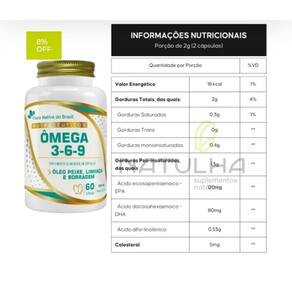 Suplemento alimentar em cápsulas a base de óleo de peixe, óleo de linhaça e óleo de borragem. Este conjunto de ácidos graxos presentes neste produto se complementam e fornecem uma diversificada fonte de ômega 3, ômega 6 e ômega 9. Como tomar Sugere-se a ingestão de 1 uma cápsula deste produto 3 três vezes ao dia, preferencialmente junto das principais refeições ou de acordo com orientação . Tabela nutricional Porção de 2g 2 cápsulas % vd Valor energético18 kcal1% Gorduras totais, das quais:2g das quais:4% Gorduras saturadas0,3g1% Gorduras trans0,0g Gorduras monoinsaturadas0,4g Gorduras poli-insaturadas1,3g Ácido eicosapentaenoico - epa120mg Ácido docosahexaenoico - dha80 mg Ácido alfa-linolênico0,53g Colesterol20 mg Valores diários com base em uma dieta de 2000 kcal e 8400 kj. Seus valores diários podem ser maiores ou menores dependendo de suas necessidades energéticas. Valores diários não estabelecidos. Ingredientes Óleo de peixe, óleo de linhaça, óleo de borragem e antioxidante dl - alfa tocoferol. Cápsula: gelatina, água purificada e umectante glicerina. Não contém glúten. Não contém lactose. Marca: Não Informado Ean: 7908041911152