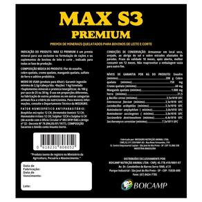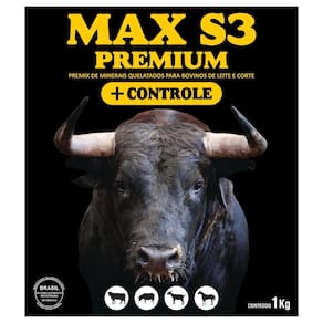 Max s3 premium é um premix mineral para uso exclusivo na formulação de rações e ou Suplementos de bovinos de leite e corte , indicado para todas as fase de produção. Composição básica do produto: flor de enxofre, cobre quelato, cromo quelato, manganês quelato, sulfato de ferro e aditivo probiótico. Modo de usar produto para diluir : garantir ingestão Mínima de 2,5g/cabeça/dia. Rações: 1 kg/tonelada Suplementos minerais e proteico/energéticos: de 100 g Por saco de 25 ou 30 kg. O uso em proporções diferentes, na fabricação de outros produtos ou em outras categorias animais fica a critério do nutricionista. Para maiores informações, consulte o departamento técnico da mozagro. Produto isento de registro no ministério da agricultura, pecuária e abastecimento. Condições de conservação: armazenar em local seco, arejado, ao abrigo do sol e sobre estrados afastados de paredes. Prazo de validade 18 meses, após aberto, melhor consumir em 12 meses. Não reaproveitar a embalagem vazia para outro fim. Níveis de por kg do produto: Enxofre mínimo ............................................................200 g Cobre quelato mínimo ................................................750 mg Cromo quelato mínimo .................................................60 mg Manganês quelato mínimo ......................................1.000 mg Ferro mínimo ................................................................31,5 g 10 bacillus cereus mínimo .....................................3,5x10 ufc 10 enterococcus faecium mínimo ..........................3,5x10 ufc 10 lactobacillus acidophilus mínimo .....................3,5x10 ufc 10 ruminobacter amylophilum mínimo .................3,0x10 ufc 10 ruminobacter succinogenes mínimo ...............3,0x10 ufc 10 succinovibrio dextrinosolvens mínimo ..............4,4x10 ufc 11 saccharomyces cerevisiae mínimo ...................7,5x10 ufc Fator homeopático : Boophilus microplus 12 ch; dermatobia hominis 12 ch; Haematobia irritans 12 ch; sulphur 12ch e sulphur 6 ch de acordo com o oficio circular nº 003 dfip/das e artigo nº 32 - decreto nº 79.094,05/01/1977 . Composição sacarose e amido como insumo inerte. Marca: Não Informado