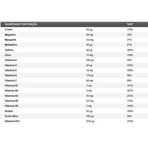 Bisglicinato de magnésio, ácido ascórbico, niacinamida, menaquinona-7, colecalciferol, L-selenometionina, betacaroteno, bisglicinato de manganês, D-biotina, palmitato de retinol, tiamina mononitrato, riboflavina, fitomenadiona, L-metilfolato de cálcio, molibdato de sódio, bisglicinato de zinco, metilcobalamina, DL-alfa-tocoferol, D-pantotenato de cálcio, fosfato de piridoxal, picolinato de cromo, estabilizante celulose microcristalina e lubrificante estearato de magnésio. Cápsula estabilizante hidroxipropilmetilcelulose, glaceantes carragena e acetato de potássio e corante clorofilina cúprica. NÃO CONTÉM GLÚTEN.