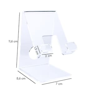 O suporte de celular em acrílico é uma estrutura projetada para segurar dispositivos móveis, como smartphones e tablets, de forma estável e segura. Possui uma base sólida para garantir estabilidade, e uma inclinação adequada para oferecer uma boa visão da tela do dispositivo, permitindo que celulares sejam colocados na vertical ou horizontal, além disso, o acrílico é um material resistente e durável, o que torna esse tipo de suporte uma opção confiável para uso diário. Sua transparência também permite que o design do dispositivo seja exibido sem obstruções, combinando com qualquer ambiente. Com seu tamanho compacto pode ser carregado para diversos lugares, tendo uma abertura na parte de trás para encaixe de carregador sem interferir no fio ou fazer com que ele se dobre, aumentando a vida útil dele.