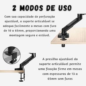 R:o suporte articulável possui uma presilha ajustável que oferece uma fixação firme em mesas com espessuras de 13 a 65mm, sem a necessidade de fazer furos. E também com opção perfuração ajustável se adequa a mesas com furos de 10 a 65mm, garantindo uma montagem segura e estável.