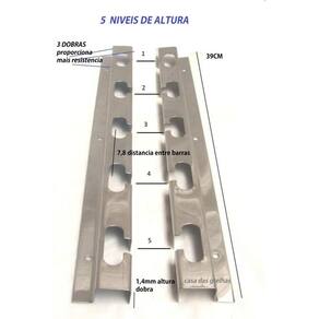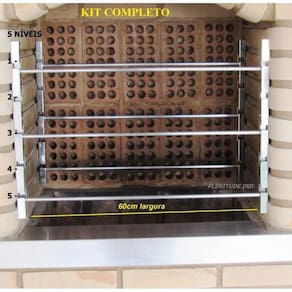 Suporte para grelha e espetos para churrasqueiras até 60cm largura com 6 tubos alumínioDescriçãoContém:4 suportes 100% inox 430 de 39cm;6 barras de tubo de alumínio comprimento de 60cm e 12mm diâmetro aguenta até 10K;Acompanha buchas e parafusos.Observação:- Atende churrasqueira até 60cm largura os suportes não compensarão o tamanho se a churrasqueira for maior confira as medidas de sua churrasqueira antes de comprar pois se for 61cm a barra poderá ficar caindo O kit de suporte serve para apoio de grelhas e espetos, pode ser instalado em churrasqueiras de alvenaria, gourmet com parede , tijolinhos .As barras podem ser serradas se a churrasqueira for menor na largura com uma serrinha manual.Características do produto:- possui 5 níveis de altura - Suporte com 3 dobras - para dar maior sustentação e chapa 0,70mm - Barra de 1/2 polegadas - Tem alta resistência a corrosão por sem em inox- Fácil limpeza, por ser inox polido- Excelente acabamento e designe, deixe sua churrasqueira moderna- Fácil instalação- utilidade em churrasqueiras de alvenaria, gourmet e pré-moldadaInstalação:Produto de fácil instalação, você mesmo instala com uma furadeira e broca de 6mm e auxílio de uma trena. Retirar primeiramente a película branca ou azul dos dois lados dos suportes.As barras podem ser cortadas Sim podem ser serradas pelo próprio comprador com uma serrinha manual em caso de a churrasqueira ser menor que 60cm.Fabricação: Plenitude Industria - Pleno IndustriaFotos ilustrativas, não acompanha grelha