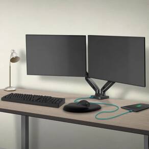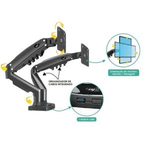 F160N Suporte Articulado de Mesa com Pistão a Gás e Regulagem de Altura para Dois Monitores de 17” a 35”. Com o mínimo esforço, posicione os monitores da maneira que desejar, sem a utilização de ferramentas. O F160N é um suporte de mesa para 02 (dois) monitores, desenvolvido com sistema de braço articulado com amortecedor a gás (pistão), que permite movimentos suaves para um perfeito ajuste de direção e altura.